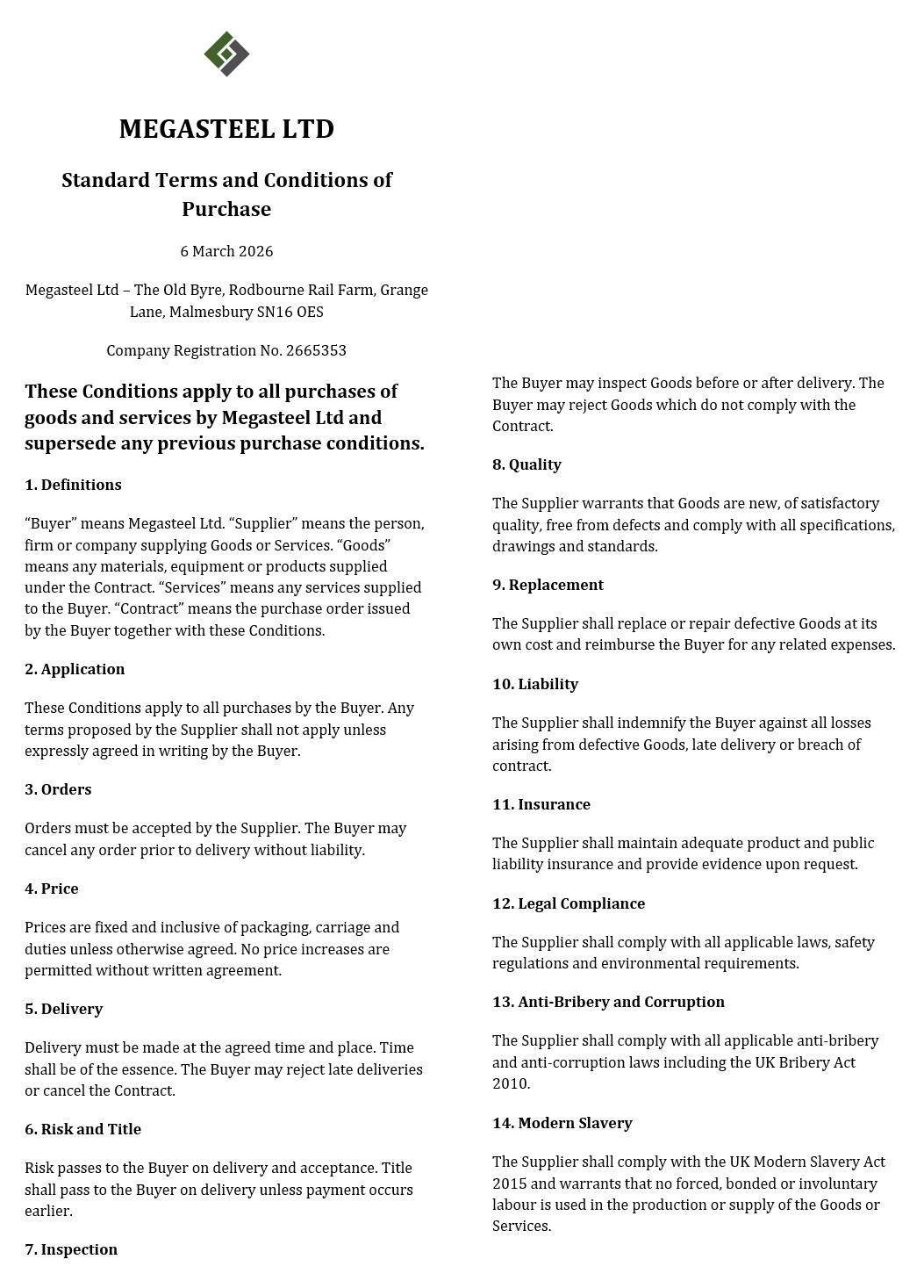Megasteel Ltd is registered in England & Wales with registered number 2665353.Registered office: The Old Byre, Rodbourne Rail Business Centre, Grange Lane, Malmesbury , Wiltshire SN16 0ES,United Kingdom VAT Registration No : GB 194 1178 95